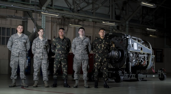 A group of aircraft maintenance students from the Philippine Air Force and the USAF work together to remove the turbine from a C-130H Hercules training engine during an aircraft maintenance course on August 23, 2017, at Yokota AB. The course is the first bilateral Philippine U.S. Air Force aircraft maintenance class to be taught at Yokota by the 373rd Training Squadron Detachment 15. (photos : USAF)