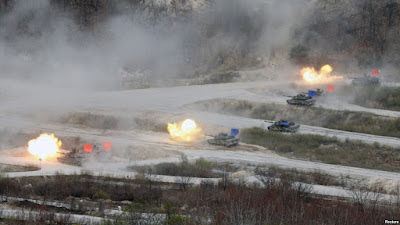 South Korean Army K1A1 and U.S. Army M1A2 tanks fire live rounds during a U.S.-South Korea joint live-fire military exercise, at a training field, near the demilitarized zone, separating the two Koreas in Pocheon, South Korea April 21, 2017.